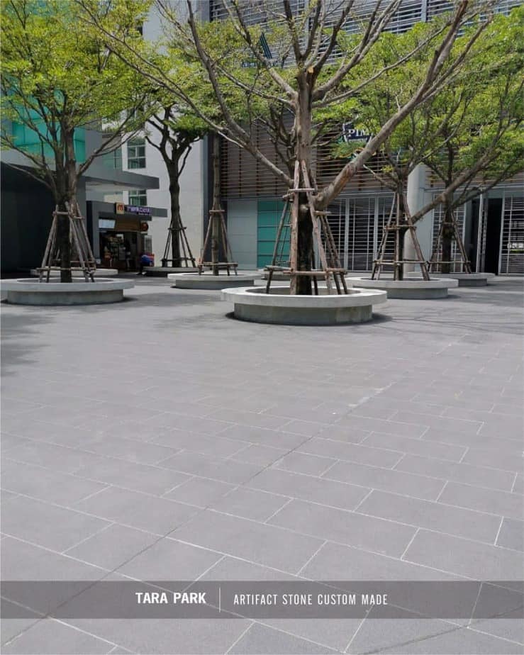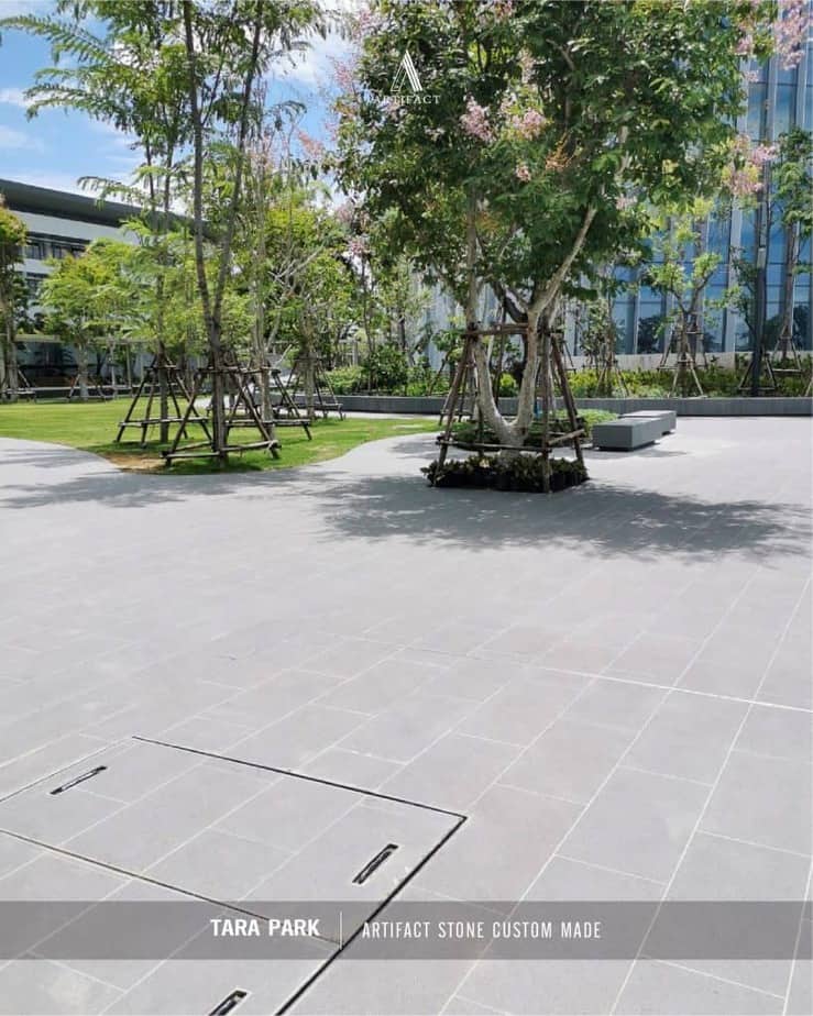 CP ALL – The Tara สำนักงานใหญ่แห่งใหม่ในพื้นที่ของสถาบันการจัดการปัญญาภิวัฒน์ ออกแบบให้มีความทันสมัย ใช้นวัตกรรมการก่อสร้างที่เป็นมิตรกับสิ่งแวดล้อม เน้นการก่อสร้างตามเกณฑ์อาคารเขียว กระจก Facade รอบตัวอาคาร ออกแบบลักษณะคล้ายน้ำตกไหลลงจากตัวอาคาร มองเห็นจากทุกมุมมอง พื้นที่บริเวณโดยรอบอาคารออกแบบภายใต้ Concept Ecological และ Biophysics Design ผสมผสานธรรมชาติ ในรูปแบบสวนป่าเบจพรรณ เน้นความร่มรื่น อากาศบริสุทธิ์ให้ความรู้สึกโปร่งโล่งสบาย มีพลังในการทำงาน ตอบโจทย์ไลฟ์สไตล์การทำงานของคนรุ่นใหม่อย่างลงตัว บริเวณพื้นถนนของโครงการได้เลือกใช้งาน กระเบื้องพอร์ซเลนลวดลายเสมือนหิน สั่งทำพิเศษสำหรับโครงการนี้โดยเฉพาะ ทำให้ได้โทนสีและลวดลายสอดคล้องกับการคอนเสปการออกแบบ ทดแทนหินแกรนิต และ หินควอตซ์ ลวดลายเสมือนหิน ผิวสัมผัสโดดเด่นที่ดีที่สุดจากอาร์ติแฟคท์ดีไซน์ พร้อมด้วยคุณสมบัติดูดซึมน้ำต่ำกว่า 0.1% ความแข็งแรงกว่าหินจริงกว่า 6 เท่า ผิวสัมผัสโดดเด่น ช่วยให้พื้นผิวกระเบื้องมีผิวสัมผัส ที่นุ่มนวลและยังลดการลื่นที่เกิดจากพื้นผิวของกระเบื้อง ครอบคลุม ทุกการใช้งานด้วย